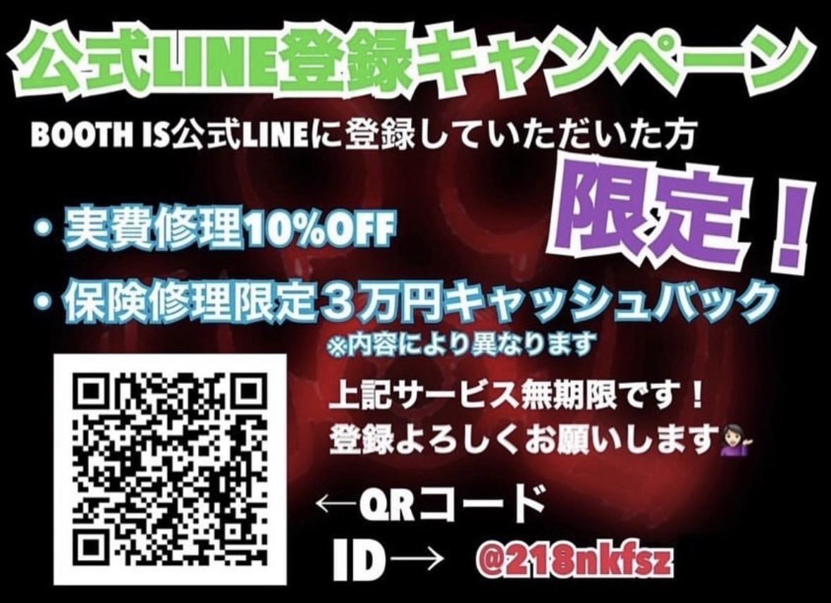 トヨタ カローラルミオン 2023/04/06 トヨタ カローラルミオンフロント右側の修理完了です😊ご利用ありがとうございます✨ 公式LINEキャンペーン 2023/03/18 3月も中旬!だんだん暖かくなってきて花粉の季節💦くしゃみが止まりません😶🌫️みなさん、BOOTH IS公式LINEお友だち追加はもうお済ですか?割引利用期限問わずのお得なキャンペーン開催中です😊キャンペーン期間は未定です!お友だち追加お待ちしてます~✨ トヨタ マークX 2023/03/27 トヨタ マークXくしゃけてしまった右側リアの部品交換+板金塗装😶綺麗に直り、喜んで頂けてよかったです✨ご利用ありがとうございました!! PREV 9 10 11 PREV